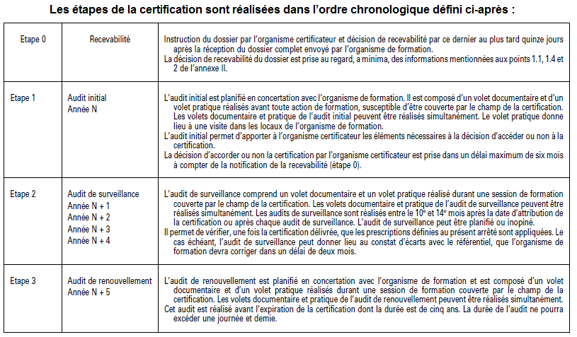 Depuis l’arrêté du 1er juillet 2016, trois étapes sont nécessaires pour valider la certification et être autorisé à dispenser des formations. La recevabilité du dossier par l’organisme certificateur est conditionnée par la qualité et la complétude des pièces transmises par le centre de formation. Les étapes de la certification sont réalisées dans l’ordre chronologique défini ci-après: